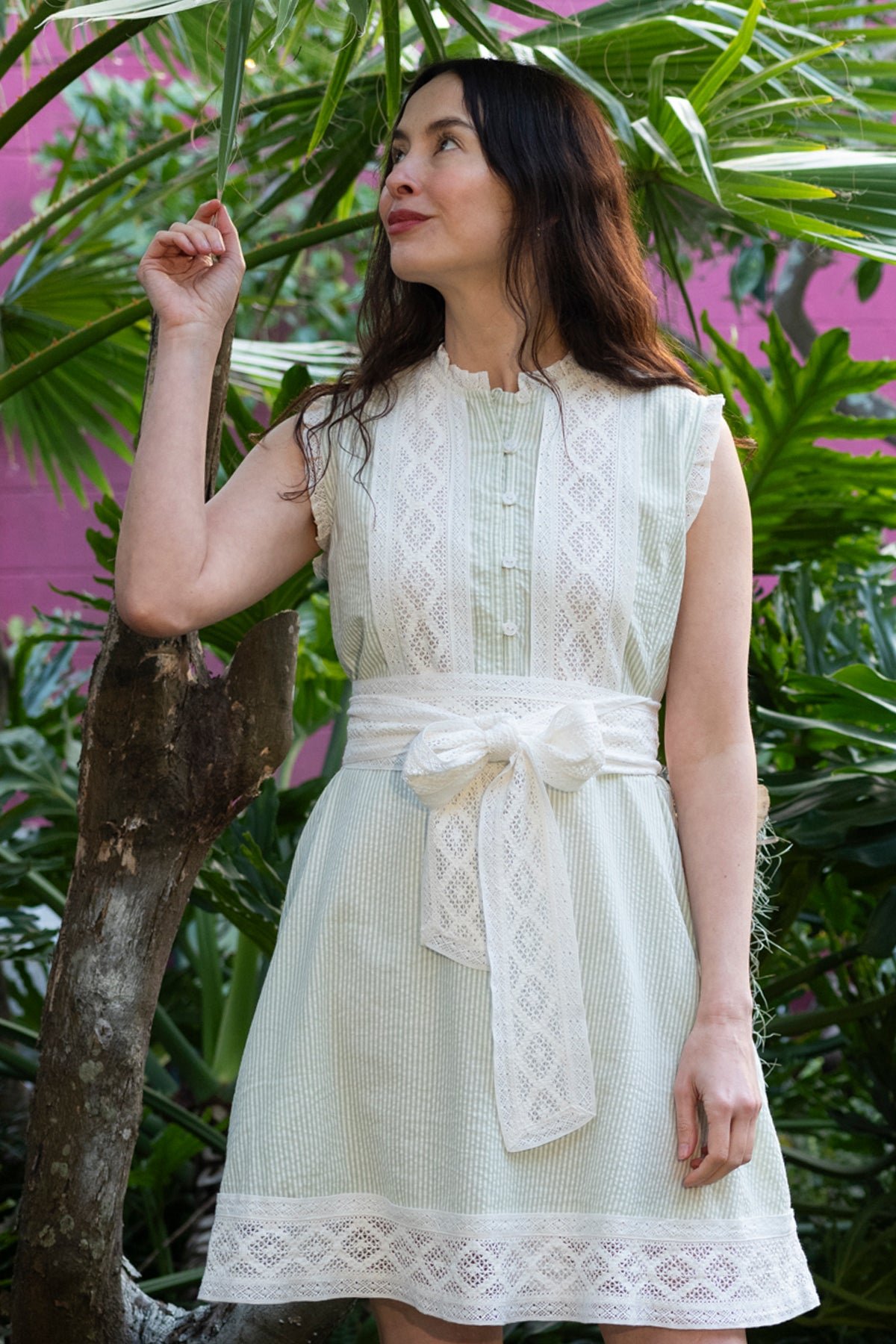 A playful take on our signature silhouette, the Sleeveless SUE SARTOR Flounce™ Mini is crafted in crisp sage green seersucker cotton for a fresh, easy summer look.• Face-framing collar• Placket button front• Contrast sash waist tie• Designed to be true to size with volume in skirt• Sleeveless mini silhouette• Side pockets• Composition: 100% cotton seersucker• Bodice is lined in light weight cotton voile